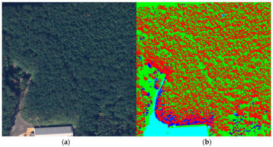 For the next step of the workflow, we predicted the four clusters for the whole 100-image dataset using the centers calculated by the GMM. Also, these outputs were collapsed into two classes, one that represented the forest and the other that represented any other entities present in the image. For this, the forest texture must be observed closely. Due to the different heights of the trees in the forest, shadows were generated, and a large portion of the pixels were darker and were grouped in a different cluster, making the forest pixel values not uniform. Figure 6 emphasizes this issue by illustrating a forest sample (a) and its corresponding clusters (b) from the training image.