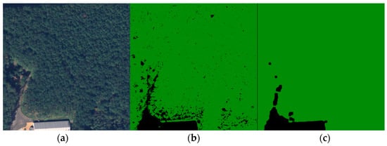 These two clusters describing forests were merged, while the other two describing crops, bare lands, or settlements were also collapsed into one class. Another important feature of the forest’s texture is the mixture of deciduous and conifer tree species. Working with images from a high-altitude area, the conifers, which have a brighter NIR footprint, were predominant. On the other hand, deciduous or withered trees found inside large forest areas, having a lower NIR footprint, were clustered as barren land or grassland. This created small voids inside forest areas as shown in Figure 7b. To address this issue properly, two filtering steps were applied to the merged images: a median filter and a closing filter, both utilizing a 9-pixel kernel. The median filter was mainly applied to reduce overall noise and various artifacts present in the image. The closing filter was constructed from two operations []. The first was dilation, which produced the maximum value if at least one pixel within the kernel possessed this value. In our case, this was the forest because the color values used for representing the two classes were (34, 139, 34) and (0, 0, 0). Consequently, dilation expanded the forest area. On the other hand, the erosion operation worked in the opposite direction. It eroded the boundaries of the foreground object, which aided in removing the mentioned holes.