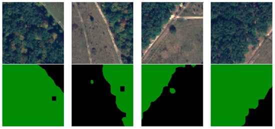 Due to the 4000 × 4000 × 4 dimensions of the images, these could not be fed entirely into the architecture. The dimensionality was also a problem regarding the labels because semantic segmentation labeled every pixel instead of an entire image. Taking into consideration that the U-Net commonly requires square powers of two to be fed, the 16 images were cut into 128 × 128. For practicality, the pixels from 3841 to 4000 were discarded, resulting in 900 samples per image and a total of 14,400 samples composed of the ground truth and their labels. The other 84 unselected images were also split, but without the two-class segmentation, and treated as unlabeled data. From the 14,400 samples, 10.000 were used for training and validation, and 4400 for testing. Conventionally, 10% of the dataset was used for testing, but the desire was to obtain correct, meaningful results, and have a better understanding of the model generalization. In object classifications, having a too-small dataset might pose some problems, but for semantic classifications, every pixel is a learnable feature for the model. Figure 8 illustrates several training samples and their labels.