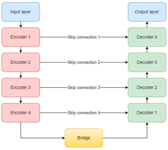 The original complex architecture is composed of one input layer, four encoder blocks, one bridge block, four decoder blocks, four skip connections, and one output layer (Figure 9). It uses the ReLU (Rectified Linear Unit) activation function for all the layers in the model, except the last one, which obviously, needed a sigmoid function []. At the end of the encoding path, a dropout layer is used to prevent overfitting.