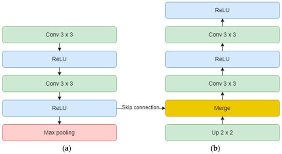 On the other hand, the decoder aims to recover the spatial resolution of the input by having one upsampling layer at the start of each block. This layer has a size of 2 × 2, translating to doubling the width and height of the previous layer, and it also uses zero padding, instead of no padding. Next is the concatenation layer which implements the skip connection technique. The incorporation of skip connections facilitates the decoder in utilizing feature maps from earlier encoder layers, ensuring the preservation of spatial information and mitigating the vanishing gradient problem. These connections play a critical role in achieving accurate segmentation by allowing the network to combine low-level and high-level features, thereby aiding in precise boundary delineation. The concatenation layer merges one convolution from the encoder block with the previous upsampling. In the end, two convolutional layers with the same number of feature maps, but backward are added. The overall diagram of an encoder (a) and a decoder (b) block is depicted in Figure 10. Finally, the output layer operates on the features obtained from the decoder. In essence, it functions as a convolutional layer with a single feature map and a 1 × 1 kernel. It condenses these features into a single-channel binary segmentation mask, which can be interpreted as a probabilistic map. By applying the sigmoid activation function, the pixel intensities are transformed into probabilities. The ultimate output is a segmentation mask that represents the likelihood of each pixel belonging to either of the classes.