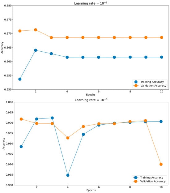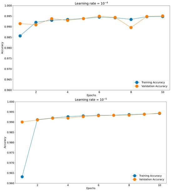 Having such good initial accuracies, we concluded the rest of the tuning to be done on 10 epochs of micro training and only the best-found scenario to be iterated, if necessary, for more epochs. Establishing the batch size and optimizer took us toward the next hyperparameter, the learning rate. The chosen learning rate holds the potential to impact the generalization proficiency of the trained model when applied to unfamiliar data. Should the learning rate be excessively elevated, the model might excessively conform to the training data, impeding its ability to generalize effectively when confronted with novel data. There is a consensus to train models using these negative powers of 10. Opting for an appropriate learning rate enables a harmonious equilibrium to be reached, enabling the model to appropriately fit the training data while mitigating the risk of overfitting. This can be observed in Figure 11, where the training and validation accuracies for the most common four learning rates are presented: 10−2, 10−3, 10−4, and 10−5. The best score was achieved for a learning rate of 10−4, which obtained the highest validation accuracy of 0.9951. The validation accuracy was also maintained closer to the training accuracy through all 10 epochs. The 10−2 learning rate badly underperformed, obtaining accuracies around 0.56, while the 10−3 learning rate had more scattered validation accuracy values compared to the training graph. In the end, the 10−5 learning rate was slower in converging than 10−4, having lower accuracy scores for both the training and validation datasets.
