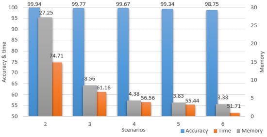For a better understanding of the study improvements, all the performance results for all the downsized scenarios are portrayed in Figure 12, where all the values represent percentages of the initial scenario. The chart has two vertical axes, the accuracy and time are projected on the left, while the memory is projected on the right. It is important to notice the accuracy maintained high percentages while the time and memory percentages constantly decreased up to the point where the model computed twice as fast and used only 3.38% of the initial memory.