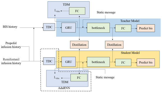 An overview of our deep learning framework for DOA prediction. The teacher model has an extra input (i.e., the BIS history), which allows the teacher model to learn a more accurate representation of the DOA and transfer the DOA representation to the student model through various kinds of layers by knowledge distillation. The AdaRNN model includes temporal distribution characterization (TDC) and temporal distribution matching (TDM), which are used to determine the K-segment intervals with the largest distribution differences and reduce cross-domain distribution differences according to the drug infusion history, thereby improving the generalizability of the model. GRU denotes the gated recurrent unit, and FC denotes the fully connected network.