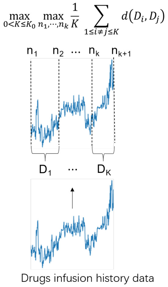According to the maximum entropy (ME) principle [28], it is reasonable to have as diverse a distribution as possible for each period to maximize the entropy of the total distribution, without any prior assumptions about how to divide the time series data. This approach allows for more general and flexible modeling of future data. In addition, the use of shared knowledge in the time series data can be maximized by identifying periods that are least similar to each other. Thus, the problem can be expressed as follows: