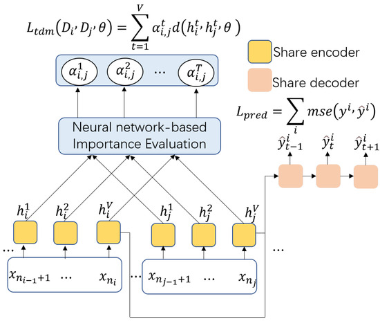 In contrast, the minimization of Formula (2) can learn only the predictive knowledge for each period and cannot reduce distribution differences between each period to exploit common knowledge. A primitive approach is to use some distribution measure of distance as a regularization term for each period pair and . Based on previous domain adaptation research [32,33] in which distribution matching is typically performed on high-level representations, Du et al. [17] applied a distribution matching regularization term to the final output of the RNN model.
