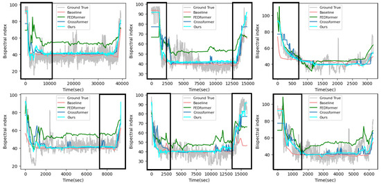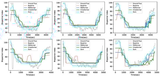 In the experiment, we conduct a comprehensive analysis of mean comparisons across all periods, including the induction period, the maintenance period, and the recovery period. The compared methods are, respectively, the baseline method [12], FEDformer [45], and Crossformer [46]. The experiment results are shown in Table 3, and are depicted as the mean ± standard deviation. According to Table 3, one can observe that, in most situations, our proposed method has better performance than other compared methods during each period of anesthesia. This indicates that our proposed method can efficiently solve these issues of the baseline method, i.e., the weak generalizability of the model and the poor performance in the induction and recovery periods. In addition, we use the vanilla transformer [47] as the transformer backbone of our pipeline; the results are shown in Table 3. Benefiting from the long-term modeling capability of the transformer model, it can effectively capture the global features of the time series data, which can effectively learn the continuous effect of anesthesia drugs on the human body; therefore, the transformer encoder can obtain more accurate features of the depth of anesthesia. In addition, there is only one case in which FEDformer outperforms the proposed model in the recovery period. The main reason may be that FEDformer is a transformer-based method that can better capture the global features of the time series and thus is more able to synthesize information before the recovery period. However, since FEDformer fails to take into account the excessive differences in the distribution of each individual, the experimental results in the final evaluation metrics (e.g., RMSE and MAE) of anesthesia prediction are worse than those of ours.