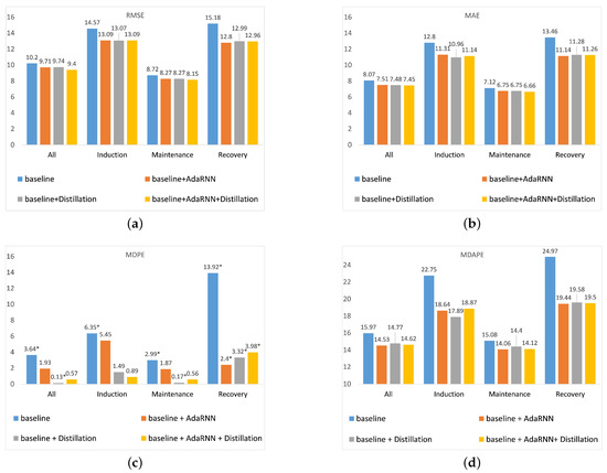According to Figure 7a, when a knowledge distillation approach is applied in the baseline model, the new model has better performance during each period. In Figure 7c,d, the MDPE achieves better performance in the induction and maintenance periods than the AdaRNN model, which indicates that the predicted values for these two periods are more accurate and display fewer fluctuations. Therefore, knowledge distillation is useful for solving the overprediction problem faced by the AdaRNN model in the induction and maintenance periods. Based on Figure 7a,b, although incorporating the knowledge distillation into the baseline model has good stability, the difference between the AdaRNN and the knowledge distillation approach is very small in terms of the RMSE and MAE. However, when the AdaRNN and knowledge distillation are used in the same model, the prediction performance can improve, and the combined model still brings good stability. Thus, incorporating knowledge distillation into the AdaRNN model results in a great improvement in our proposed work.