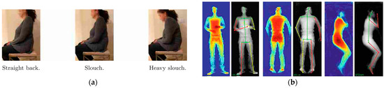 In the following literature review, the term “human posture estimation” is generally used for refer to the detection of human posture (joint angles, sitting positions, sleeping positions, etc.) from a measured data set. Examples of slouch detection and sleeping posture are shown in Figure 2. In the case of our literature review, the data on which the estimation is based are limited to pressure maps and force vectors. We also included studies from the representative literature for the review that use activity recognition and re-infer the most probable posture. This method can be applied if the activity is dominated by instinctive movements like gait activities and is not influenced by external boundary conditions, like in the case of a working posture. It is unique for a certain task and working environment.