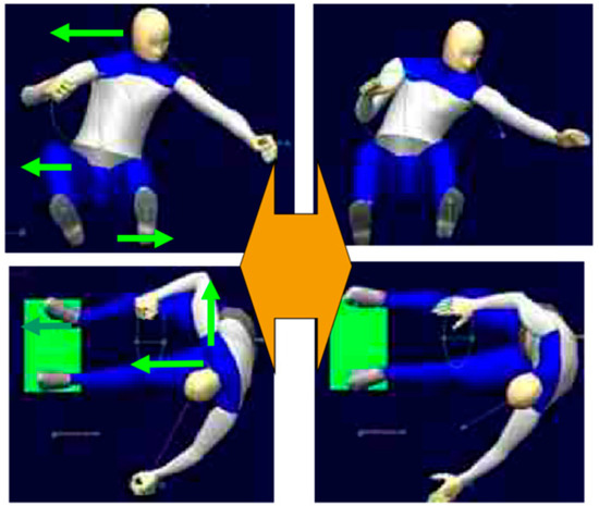 Using the RAMIS DHM for estimating the drivers posture closing a car door (left: force-based estimated posture, right: video-recorded real posture, green arrows displays the external forces for the FPE) [90].