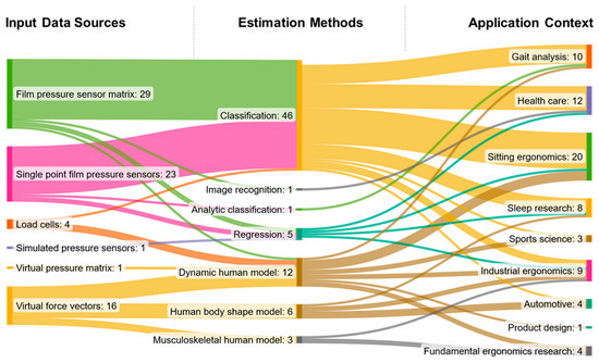The Sankey diagram (Figure 9) shows the connections between the input data sources, the estimation methods and the application scenarios for which the estimation methods are used. It also shows the percentage of times each data source, method, and application are used in the reviewed studies. When dividing studies into those with ML-based methods and DHM-based methods, the classification algorithms favor ML-based estimation methods, while the basic dynamic human models favor the DHM-based estimation methods. Furthermore, film pressure sensor matrices and single-point film pressure sensors are the main input data sources for the classification, and virtual force vectors are mainly used as input for DHM-based posture estimation. The utilization of the different methods is evenly distributed among the different applications. Only in the healthcare domain—especially for patient monitoring—classification algorithms dominate. The main applications are patient monitoring in the healthcare domain and product optimization in various subdomains of ergonomics.