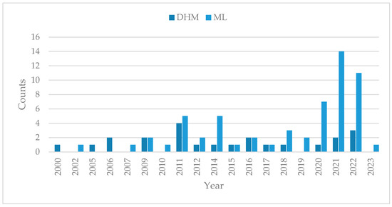 The histogram in Figure 10 shows the emergence of DHM-based methods for human posture estimation, with the investigation of these methods starting in the early 2000s. There has been a notable increase in the number of publications on ML-based methods since 2007, indicating a growing interest in recent years. In contrast, the number of publications on DHM-based methods has remained relatively constant over the years.