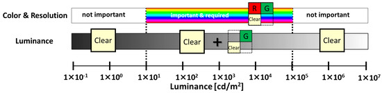 The following features are used for sensing and viewing applications. The importance of color, resolution, and luminance depends on scene brightness. The required color and resolution information for each luminance is shown in Figure 1.