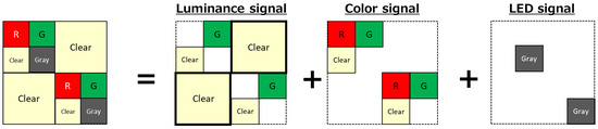 The color filter of the quadrate pixel consists of green, red, clear, and gray, and the color filter of the square pixel consists of clear. It specializes in acquiring luminance signals by using high-sensitivity green and clear pixels in dark or low-light environments. In scenes that require color recognition in medium illumination, the signals of the red, green, and clear pixels of the pixel are used. For LED signal acquisition, low-sensitivity gray filter pixel signals that are difficult to saturate even with long exposure are used.