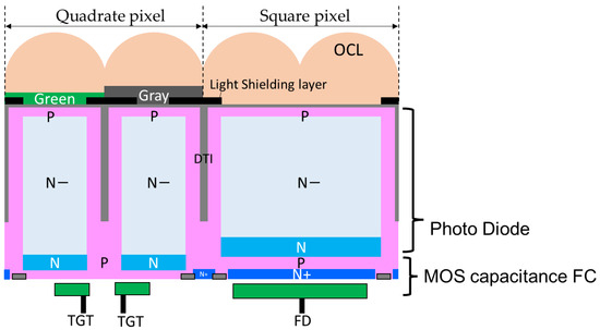 A quadrate–square pixel is a combination of a 1.5 μm pixel with a four-pixel sharing configuration and a square pixel of a 3 μm pixel with an in-pixel floating capacitor (FC). Figure 7 shows a cross-sectional view of a quadrate–square pixel. The shape of the on-chip micro lens (OCL) is arranged in the same shape as the quadrate–square pixel. The light attenuation rate of gray pixels is controlled by the thickness of the gray filter and the opening width of the light-shielding layer. In a square pixel, the area of the photodiode (PD) and the FC are the same. In addition, DTI (Deep Trench Isolation) composed of an insulating film is used to electrically separate the pixels. The staggered arrangement of four small quadrate pixels and one big square pixel is a 6 μm period pixel. All of these layouts are drawn with design rules that guarantee process margins, so there is no impact on yield.