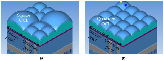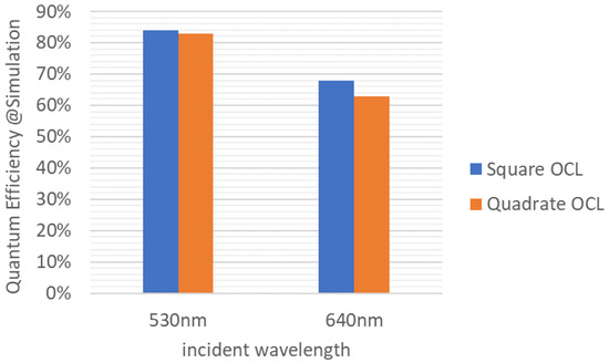 As shown in Figure 9, when the quantum efficiency at incident wavelengths of 530 nm and 640 nm was estimated by optical simulation, almost the same results were obtained regardless of the shape of the OCL. It is considered that this is because the light-receiving surface is sufficiently wide for the size of the light-harvesting region. In addition, the shape of the OCL is the same as that of the quadrate–square pixel b because the process stability is superior, and the quadrate OCL is applied.