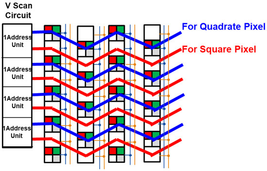 As shown in Figure 11, the drive lines for the quadrate–square pixel are output from a single vertical scanning drive circuit as a pair with these two. The blue line is a set of drive lines for driving the Quadrate Pixel. The red line is a set of drive lines for driving the Square Pixel. Since quadrate–square pixels are staggered, the drive wiring layout is also connected in a zigzag pitch in the H direction. However, the wiring layout is designed so that the respective drive signals of quadrate–square pixels do not interfere with each other’s nodes.