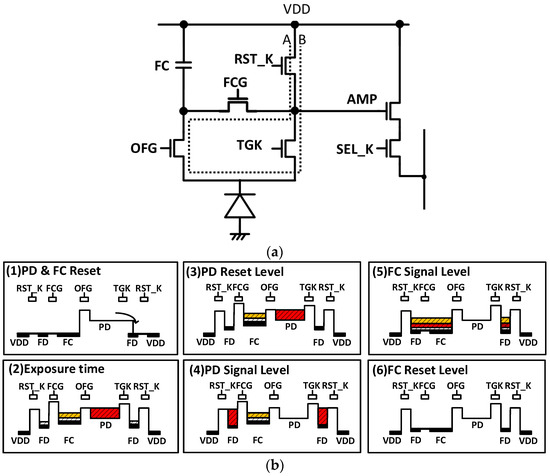 Figure 12b shows the square pixel potential diagram. The cross-section in Figure 12b shows the path of the perforation line A-B in Figure 12a. First, the PD and FC are reset to start exposure. For this purpose, TGK, FCG, and RST_K are switched to reset the charges on the PD and FC (Figure 12(b1)). During the exposure period, RST_K is turned off and FD is not put in the reset state (Figure 12(b2)). This is because the RST_K can be turned off to couple FD and TGK and lower the potential under TGK. This ensures that the saturated charge generated in the PD during the exposure period overflows the charge to the FC. When the readout period is entered, the FD is reset by turning on RST_K with TGK in the off state. RST_K is then turned off and the reset level of the square -PD is sampled (Figure 12(b3)). The difference between Figure 12(b2,b3) is that the dark current generated by the FD during the exposure period is reset in Figure 12 (b3). Then, by switching the TGK to ON, the electrons of the PD are transferred to the FD. The PD signal level is sampled. (Figure 12(b4)). Thus, in the readout period, the PD signal is read out through TGK by a CDS readout. Next, the overflow charge in the FC is read out through the FCG by a DDS readout. After FD is connected to the FC by turning FCG on, the signal level of the FC is sampled (Figure 12(b5)). Again, the RST_K is turned on and the electrical charges of FD and FC are reset and sampled as the reset level of the FC when RST_K is turned off (Figure 12(b6)). Thus, a PD signal with low noise and an FC signal with high saturation are read out.