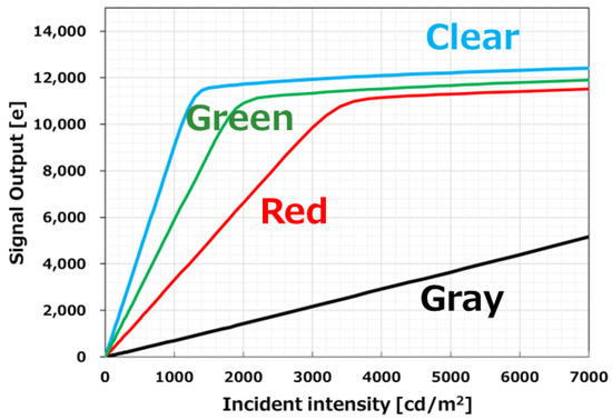 Also, the sensitivity of the gray pixel for the LED is 550 e−/lux·s, which is 1/20 of the clear pixel sensitivity of 10,800 e−/lux·s. As a result, the dynamic range for gray pixels is 103 dB, and the illuminance saturation is 5600 cd/m2 after 11 ms accumulation. In addition, constant and stable quantum efficiency is obtained for wavelengths in the visible light region.
