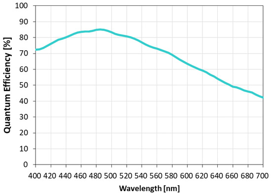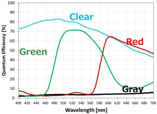 Figure 15 shows the quantum efficiency for each wavelength of clear pixels, green pixels, red pixels, and gray pixels. Clear pixels show up to 82%.