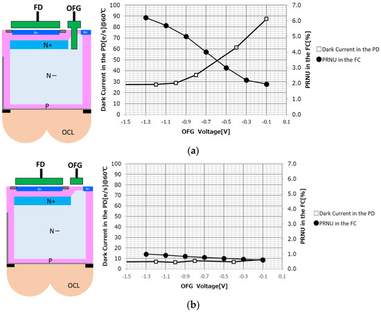 As shown in Figure 17a, at the oxide film interface of the VG, it is necessary to apply a lower negative bias of the OFG to strengthen the pinning and suppress the dark current. On the other hand, when the negative bias is lowered, the transfer path from the PD to the FC is not smooth and the PRNU increases. In the VTG, both the dark current and the PRNU fluctuate greatly with respect to the OFG, and there is no compatible solution.