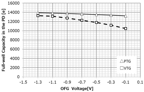 Figure 18 shows the dependence of PD saturation charge on OFG negative bias for the VTG and PTG. Similar to the aforementioned dark current and PRNU, the amount of PD saturation charge is also determined by the potential under OFG; because VTG has a higher modulation, the decrease in PD full-well capacity is more pronounced at higher OFG applied voltages than at the PTG.