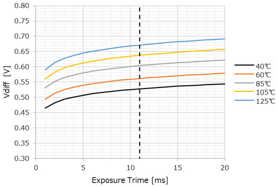Figure 20 shows the calculation results based on Equations (2) and (3). The horizontal axis is the exposure time texp, and the vertical axis is the potential difference Vdiff that can prevent charge leakage through the TGL during the exposure time. In other words, it is the potential difference when the outflow time is longer than the exposure time. Temperature dependence is also shown.