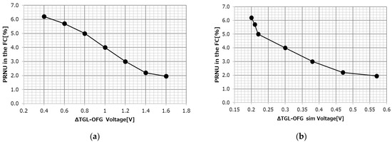 The validity of the calculated predictions shown in Figure 20 was verified by the results of actual measurements. Figure 21 shows the results of the OFG dependence of the PRNU of the FC measured at 85 °C for 11ms accumulation. The horizontal axis is the difference voltage between the actual TGL and OFG applied voltage in (a) and the potential difference between the TGL and under OFG obtained by simulation in (b).