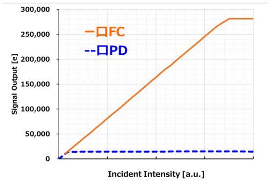 The sensitivity is 40,400 e−/lx·s, the PD full-well capacity is 13,500 e−, and the PD + FC full-well capacity is 280,000 e−. Since RN is 1.4 e−, the dynamic range is 106 dB using Equation (4). In many papers, the denominator N in the SN calculation is defined as random noise.