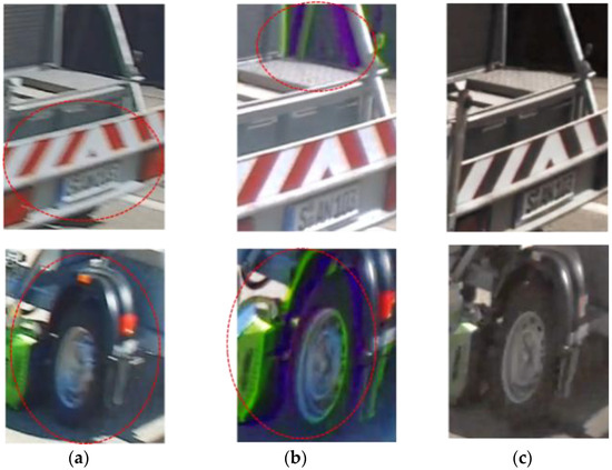 Figure 29 shows an image of a moving object. In (a) is an image of one-shot HDR in a long exposure for LFM. Motion blur occurs during exposure. As shown in the red circle, the letters and numbers on the license plate cannot be read because of motion blur. Also, the hole in the wheel of the tire cannot be recognized. In (b) is an image of digital overlap (DOL) HDR synthesis with time-division exposure, and motion artifact occurs. Part of the image is colored green or purple, as indicated by the red circle. This occurs when combining long and short exposures in a high-contrast scene. As a result of applying the synthesis gain, when the output of the green pixel signal is higher than the pair of red and blue pixels, it becomes green, and when the output is lower, it becomes purple. In (c) is an image when using quadrate–square pixel architecture. Being motion-artifact-free and motion-blur-less are realized because it includes long exposure and short exposures with a square pixel.