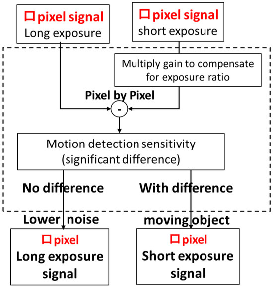Figure 30 shows the flow of motion detection applied to this work. Each pixel signal of the square is compared between the long-exposure and short-exposure signals for each pixel to determine if there is a signal difference. At this time, the square signal of short-time accumulation is multiplied by the exposure ratio gain and compared. If there is a difference, the short-time exposure signal is selected. If there is no difference, the long-time exposure signal with less noise is selected. If there is a difference, it is assumed that there is motion and a signal with a short exposure time is selected. Incidentally, the short-exposure square signal is corrected for the exposure ratio and sensitivity ratio. In other words, at this time, the square signal of short exposure contains digital noise. Therefore, the square signal of long exposure has less noise. In this way, motion detection is performed for each pixel and synthesized. In this way, this motion detection achieves both “motion-artifact-free” and “motion-blur-less” motion detection.