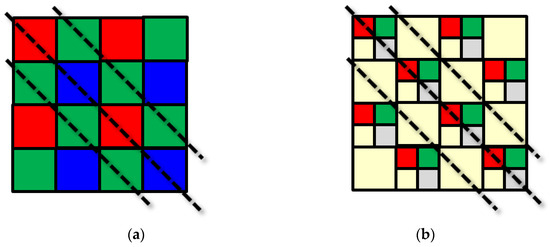 As shown in Figure 32a, in principle, interpolation with a Bayer array has limits on the performance of demosaic processing. A direction detection error occurs every frame. However, as shown in Figure 32b, in this work, thanks to the array of 1.5 μm pixels, there are clear pixels in all pixels within the 3 μm pitch. Thanks to this clear pixel, there is no need for direction detection because clear has all pixels. Horizontal, vertical, and diagonal edge detection is easier than the 3 μm pitch Bayer array, and aliasing is improved. This also improves resolution. So, the quadrate–square pixel is advantageous for horizontal, vertical, and diagonal edge detection, improving aliasing and resolution.
