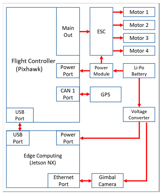 The hardware architecture of the experimental UAV in this study comprised the UAV body, a gimbal camera, and an edge-computing module. The UAV used is an AXM-Q7009 4-rotor UAV (AVIX, Taichung, Taiwan) with a diagonal footprint of 702 mm and weight of 2.6 kg. The UAV was powered using a LiPo battery of 17,600 mAH (2 kg) and had a hover time of 30 min, as listed in Table 2. The Pixhawk Cube Orange+ is used as the flight control system. The UAV is equipped with an AXG-AS03F, a mini 3-axis gimbal camera weighing 285 g with dimensions of 96 × 79 × 120 mm. Owing to its lightweight design, the camera is suitable for installation on UAVs with a weight constraint. The camera has 12.71 megapixels and an optical zoom of 3.5 X for image capturing, as detailed in Table 3. In addition, the UAV is equipped with a lightweight, high-efficiency NVIDIA Jetson Xavie NX edge-computing module for YOLO image recognition. Despite having a lower computational capability than the NVIDIA Jetson AGX Orin, the NVIDIA Jetson Xavie NX surpassed its weight by only 200 g, while the NVIDIA Jetson AGX Orin weighs 1 kg. Accordingly, the NVIDIA Jetson Xavie NX is more suitable for installation on UAVs for image recognition. Figure 3 and Figure 4 illustrate the hardware architecture of the UAV and the wiring diagram of the hardware. In Figure 3, the hardware architecture of the NVIDIA Jetson Xavie NX serves as an onboard main control system and is connected to the Pixhawk flight control board through Mavlink for UAV flight. In Figure 4, the NVIDIA Jetson Xavie NX is connected to the gimbal camera through an EtherNet connection and controls the filming direction of the camera.