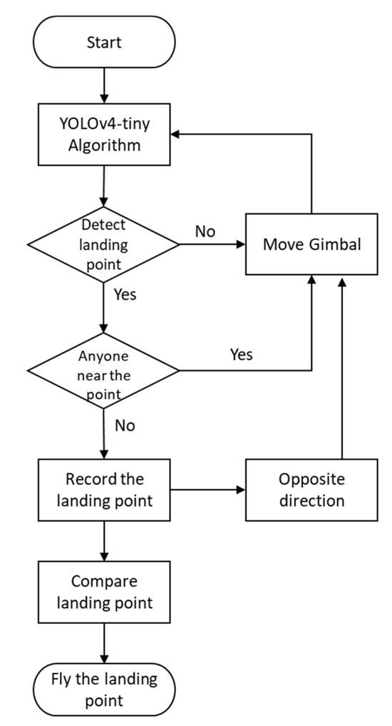 As in Figure 5, the flowchart by the tracking gimbal control system for the purpose of searching for a landing point is depicted. The scenarios for the landing point detection process can be achieved as follows: First, the Yolov4-tiny algorithm is activated to search for any possible target landing points. After detecting a landing point, the module can determine whether any humans or other objects are present. If the landing spots are candidates which would not hinder the UAV during landing, the landing point can be recorded as a potential landing point. However, if the algorithm detects humans or other objects that may hinder UAV landing, the automated gimbal tracking control module can adjust the detection angle of the camera and continue the detection process. If all landing spots in the detection direction of the camera is finished, the gimbal control module can turn the gimbal camera toward the opposite direction and continue the detection process. Once the search tracking control is completed, the module can compare all the potential landing points and choose the most suitable one in a future study.