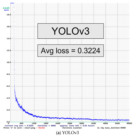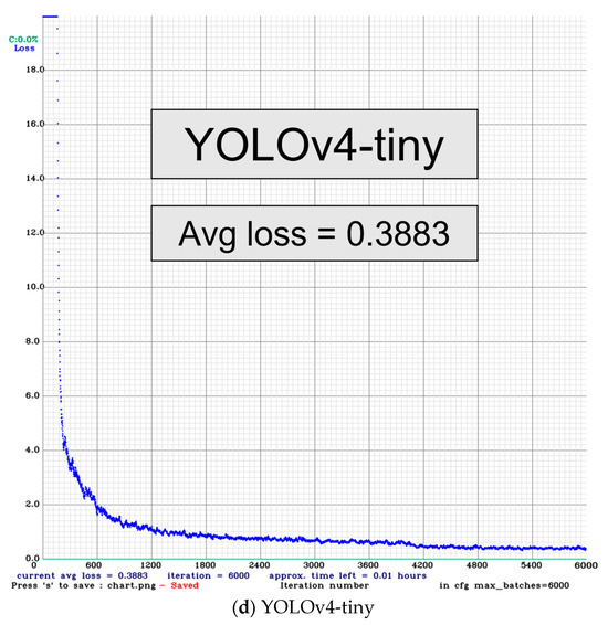 The loss function of the YOLO training was presented in Figure 7. The average precision (AP) and mean average precision (mAP) for the labelled categories are presented in Table 6. From high to low, the accuracy for the YOLOv4, YOLOv3, YOLOv4-tiny, and YOLOv3-tiny are 92.6%, 82.2%, 79.6%, and 63.8%, respectively.