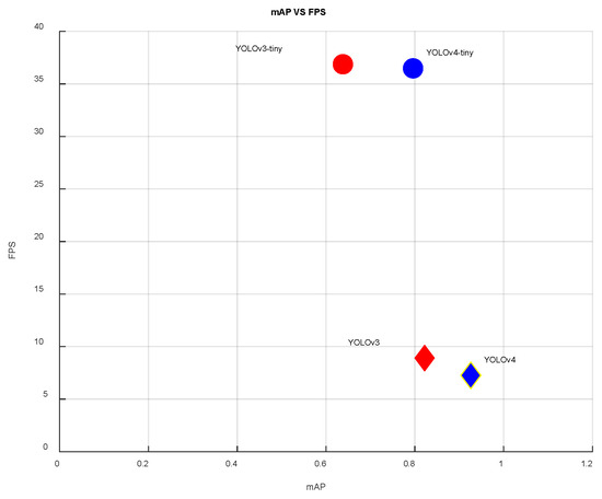 Performance of YOLOv3, YOLOv4, YOLOv3-tiny, and YOLOv4-tiny in mAP and FPS.