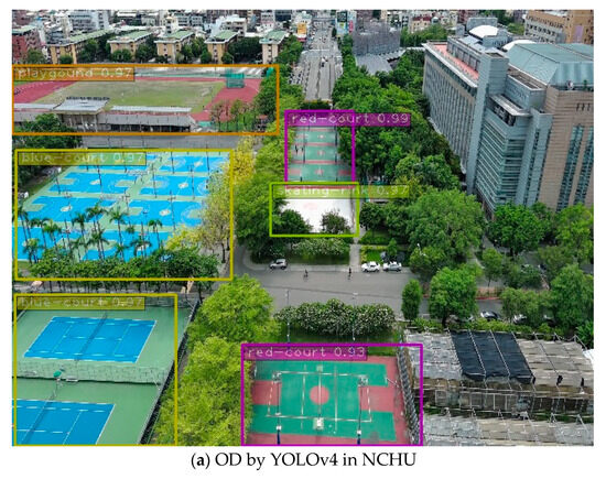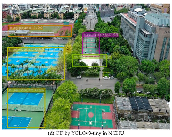 OD images of the actual identification performance in NCHU by (a) YOLOv4, (b) YOLOv3, (c) YOLOv4-tiny, and (d) YOLOv3-tiny.