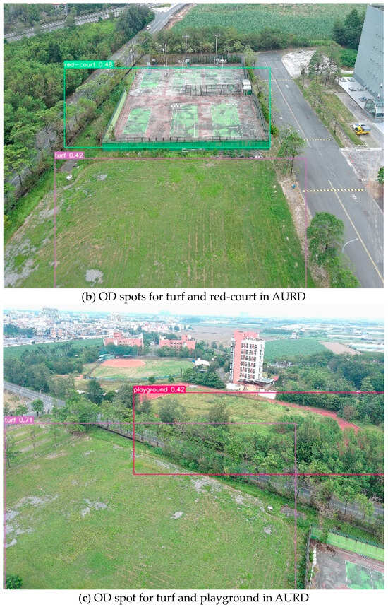 Illustrating the ability to image the actual identification performance in other fields, the application of the UAV’s OD by developed YOLOs was for the purpose of recognizing the un-pretrained landing point. This was extended to the Asia UAV AI Innovation Application R&D Center (AURD) in Chai-Yi, Taiwan. The distance between the NCHU and the R&D Center is more than 100 km. Although the accuracy may slightly decrease due to the changes in the environment, the experimental data demonstrate that the developed system can effectively label the landing points in various locations. The experimental results show the adaptability to different field conditions by the developed automated tracking gimbal control camera with the YOLO computation (Figure 10).