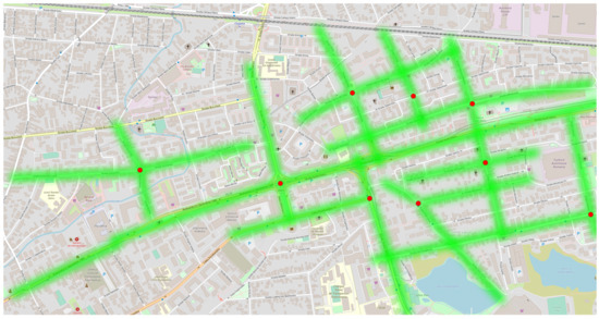 For each sensor, the proposal is that it can offer an accurate air quality measurement for an area within a 500-m radius. Each node is mapped on the map with a green dot.