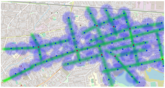 Figure 7 presents a solution tailored for densely populated urban areas. It suggests deploying nine gateways to achieve almost complete coverage of the designated zone. To ensure the precise monitoring of pollution levels throughout this extensive region, the recommended placing of the end node clusters is at intervals of 200 m. In this arrangement, for our illustrative scenario, a total of 59 sensors would be necessary to ensure comprehensive coverage of the entire area, as depicted in