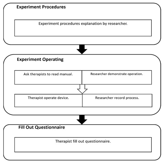 The experiment process is shown in Figure 2. First, the operation method is demonstrated to the therapist, then a standardized patient is asked to simulate the situation in the treatment room, and finally, the therapist is asked to fill in a questionnaire in the interview. The demonstration takes about fifteen minutes; then, the therapist has fifteen minutes to practice the operation process. After the practice, the therapist will operate the device following the simulated situation, and it takes about thirty minutes. The standardized patient acts like a patient who has right hemiplegia 2 months after stroke and is Brunnstrom Stage II, and the setting environment is in an independent treatment room in the hospital, and there are only therapists, patients, and family members or caregivers in the room. Training tasks and function testing include passive range of motion (PROM), functional activities, troubleshooting procedures in emergencies, etc. There are two types of questionnaires: multiple-choice and open-ended questions (Supplementary materials). Participants fill out the questionnaire in an interview. The content of the questionnaire includes the safety of the rehabilitation robot for therapists and patients, the clinical applicability of the robot’s functions and the operational process, and the ease of use of the operational process. We also inquired about suggestions for the future development of the robot.