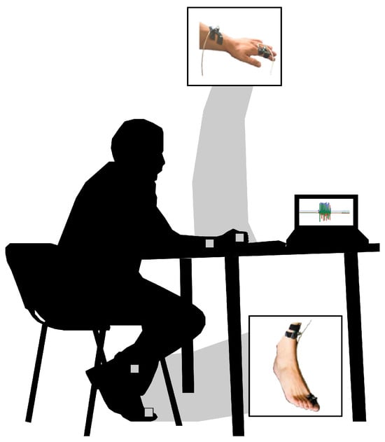 The setup for sensor placement for upper extremity and lower extremity data collection. Images of the hand and the foot are reproduced with permission [18].