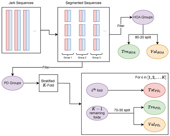 The first step was to divide our sequences and labels into training, validation, and test sets, as Figure 2 displays. For each task, we selected the corresponding segmented sequences. All segmented sequences that originally belonged to the same original sequence were placed in the same group. In doing so, we prevented segmented sequences from the same test session from crossing over from training or validation sets to the test sets, which could artificially boost the model performance. We then filtered these groups into a set of groups for HOA participants and a set of groups for PD participants. The HOA groups were divided into a training set and a validation set with an 80-20% random split.