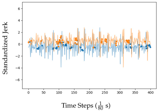 where the length N of the recording was arbitrary, and two accelerometers were used. The derivative of the resultant of each accelerometer, or jerk, was calculated. Further, the root mean square was taken over the time series sequences using a 1 s window. Since the length N of each time series sequence was arbitrary, overlapping snippets of five seconds in duration (i.e., 400 data points) from the recordings were segmented out. Each segmented sequence was standardized at an individual sample level (mean and standard deviation were calculated for each segmented sequence). Additionally, each of these segmented sequences shared a motor impairment severity label associated with the movement of the participant for the given task. These labels, originally scaled in the range of 0 to 4, were aggregated to either low (0/1) or high (3/4) levels of motor impairment. We ignored all sequences labelled as severity level 2.