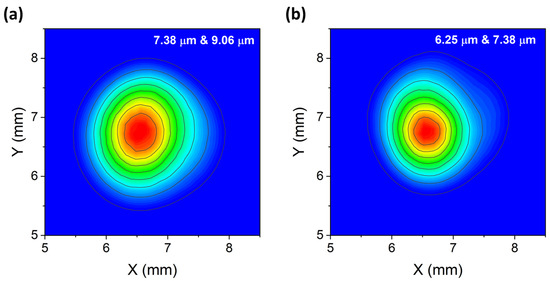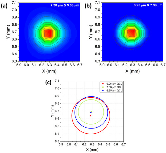 A pyrocamera (Pyrocam III, Ophir Spiricon, Darmstadt, Germany) with high-resolution pixel dimensions of 0.08 × 0.08 mm was used for the beam alignment and for acquiring and analyzing far field beam profiles at different distances from the 3λ-QCL module. The collinearity of the three beams was firstly evaluated by analyzing their spatial overlap at 25 cm from the 3λ-QCL module, where the focusing lens of the QEPAS sensor was supposed to be located. The beam profiles were acquired in pairs, namely, the 7.38 μm beam together with the 9.06 μm beam and the 7.38 μm beam with the 6.25 μm beam, as shown in Figure 2a,b.
