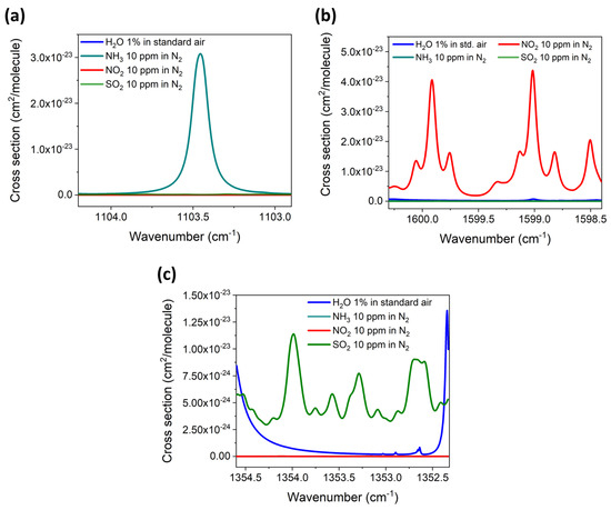 For each of three analytes, the absorption cross-section was reconstructed within the spectral dynamic range of the related QCL by using the HITRAN database to simulate a mixture of 10 ppm of the analyte in N2 [27]. To ensure that the other two analytes, H2O, and other standard air components did not interfere with the detection of the selected analyte, mixtures consisting of 10 ppm of the other two analytes in N2 and a mixture of 1% of H2O in standard air were also simulated within the same spectral range of the QCL. The results of the HITRAN simulations are reported in Figure 5a–c for each target analyte.