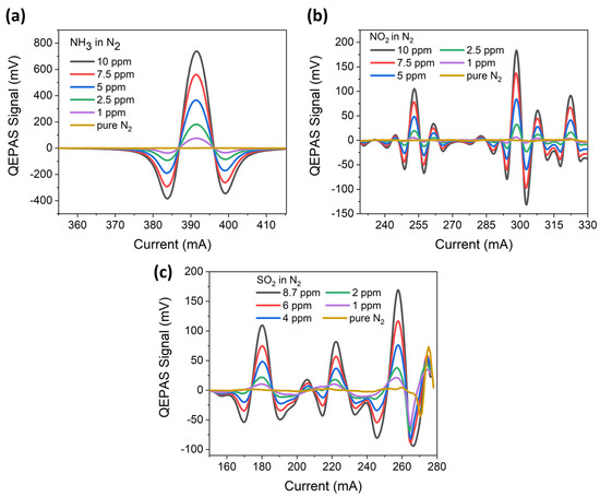 The 3λ-QCL QEPAS sensor was calibrated to detect the selected absorption species, i.e., NH3, NO2, and SO2. First, the sensor was operated to target each absorber independently. The optimal absorption lines were selected to provide both the highest intensity and the lowest interference with spectral lines of other absorbers.