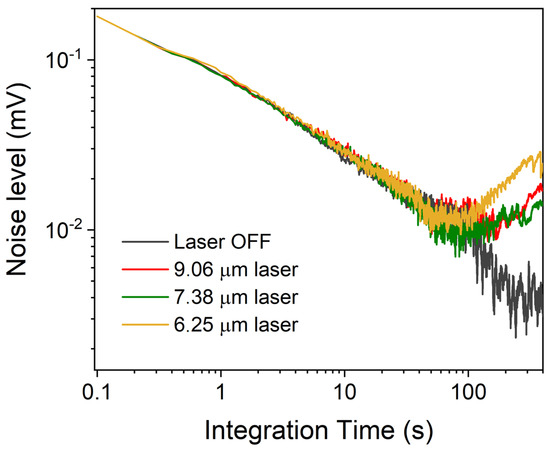 To investigate the stability of the developed sensor, an Allan–Werle deviation analysis of the QEPAS signal was performed [29]. Each laser source was operated at a fixed current far from the absorption features, with a 2 h-long acquisition of QEPAS signals in pure N2 performed at a 0.1 s lock-in integration time. The measurements were taken under the same experimental condition set for the sensor’s calibration. The results are shown in Figure 8.