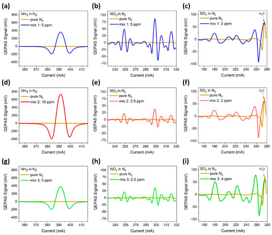 QEPAS spectral scan of NH3 (a), NO2 (b), and SO2 (c) in Mix #1 NO2; NH3 (d), NO2 (e), and SO2 (f) in Mix #2; NH3 (g), NO2 (h), and SO2 (i) in Mix #3. The peak at 275 mA observed for pure N2 is due to residual H2O in the gas line.