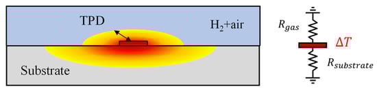 Several crucial considerations come into play when utilizing the bi-directional 3ω method for gas measurement. The thermal conductivity of gases, excluding cases like hydrogen and helium, generally falls below ~0.1 W·m−1·K−1, one or more orders of magnitude lower than that of typical 3ω sensor substrates like SiO2. Selecting a substrate with higher thermal resistance is essential to enhance sensitivity in measuring such low thermal conductivity samples. For example, we consider a 3ω sensor on a SiO2 substrate for measuring the thermal conductivity of a gas with 1/10 of the thermal conductivity compared to the substrate. The heat generated by the microheater flows through the substrate and the gas in a parallel thermal resistance circuit, as shown on the right side of Figure 2. Because the thermal resistance of the substrate is one-tenth that of the gas side, most of the heat generated in the microheater flows to the substrate. Consequently, the sensitivity to the thermal conductivity of the gas, and thus the measurement accuracy for changes in hydrogen concentration, is diminished [11].